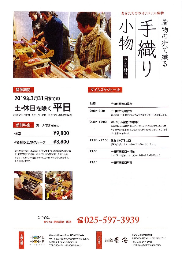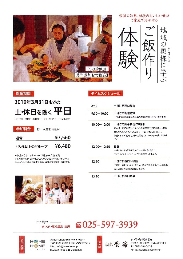 NEWS2018/06/12 体験メニュー追加のご案内 雪国の知恵、越後のおいしい食材をご家庭で活かせる、地域の奥様に学ぶご飯作り体験と着物の街で織る、毛織り小物体験ができるようになりました。 前へ 次へ 一覧へ戻る ご予約・空室案内はこちら